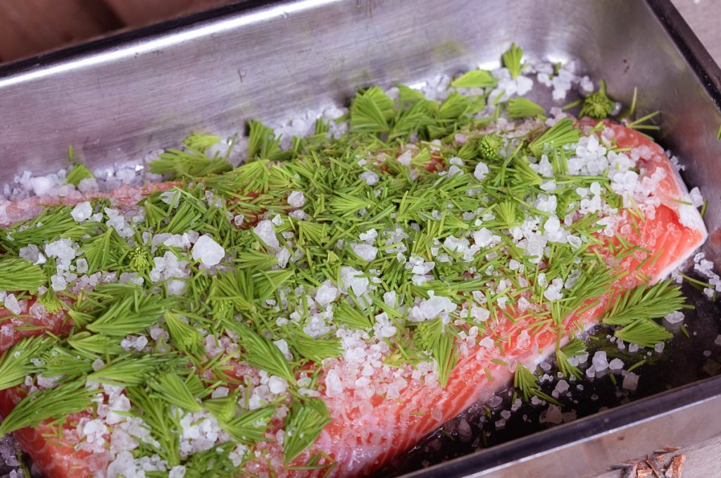 Kasvatettu kirjolohi ja sen serkku, norjalainen kassilohi ovat tunnetusti kalalammikoiden ja pussikalafarmien broilereita eivätkä varsinaisia jalokaloja vaikka lohien sukuun kuuluvatkin. Kasvatusolot teollisine rehuineen tekevät näiden rasvasta joskus vähän tympeän oloista eikä itse prosessikaan gastronomin mieltä ylennä. Mutta graavaamalla tai kylmäsavustamalla molemmista saa kyllä oikein maukasta, ellei peräti herkullista syötävää. Tällä kertaa kustomoin norjalaisen kassilohen nykyään niin trendikkäällä villiruokamenetelmällä, eli hain lisämakua kuusenkerkistä. Kuusenkerkät ovat muuten varsin monipuolisia ja maultaan erinomaisia luonnonantimia moneen paikkaan. Sekä makeiden että suolaisten ruokien höysteeksi käyvä kuusenkerkkäsiirappi taitaa olla tunnetuin jaloste tästä kevään herkusta.